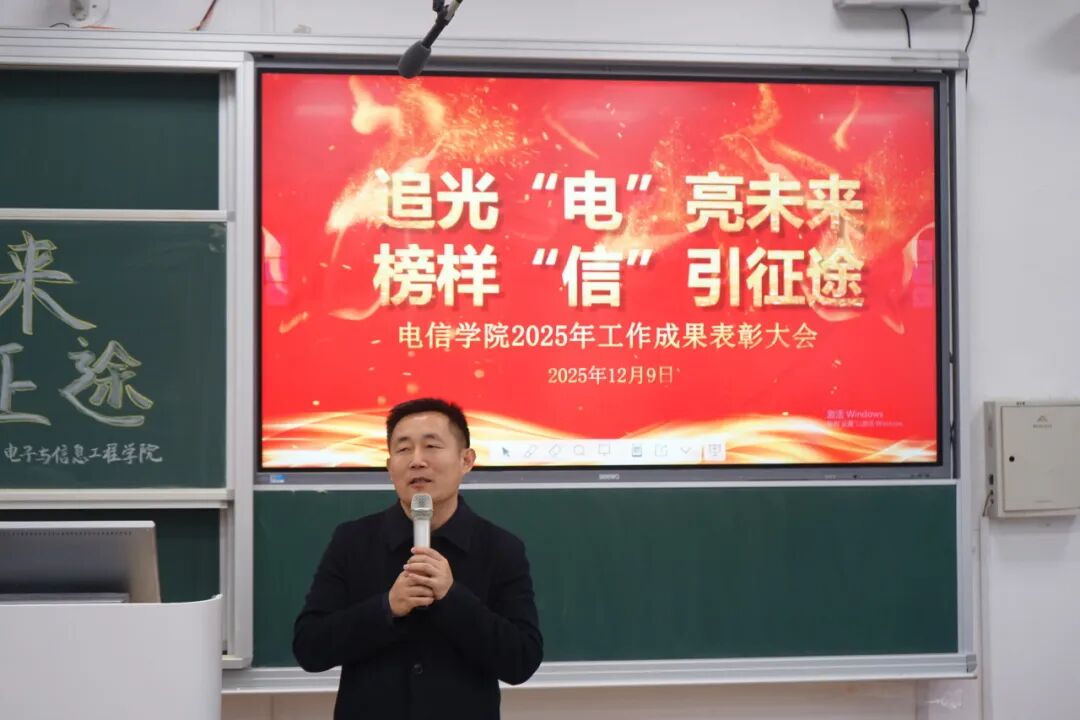 为进一步筑牢学风建设根基,发挥先进典型的示范引领作用,12月9日,电信学院工作成果颁奖典礼在博闻楼一合圆满举办。本次颁奖典礼由电信学院研究生会成员付金尉主持,学院党委书记王会立、副院长曲强担任颁奖嘉宾,学办老师施春妮,以及2024级、2025级研究生代表共同参加。