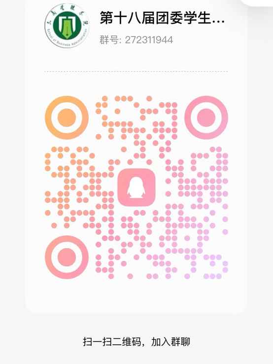 五、本次选拔报名截止时间为2024年3月7日,请报名同学于17点前将报名表交到工商管理学院B219学生会办公室,逾期无效。报名表见QQ群,群二维码如下: