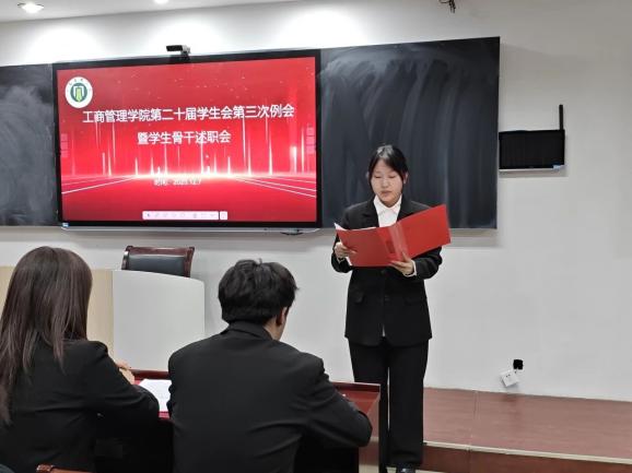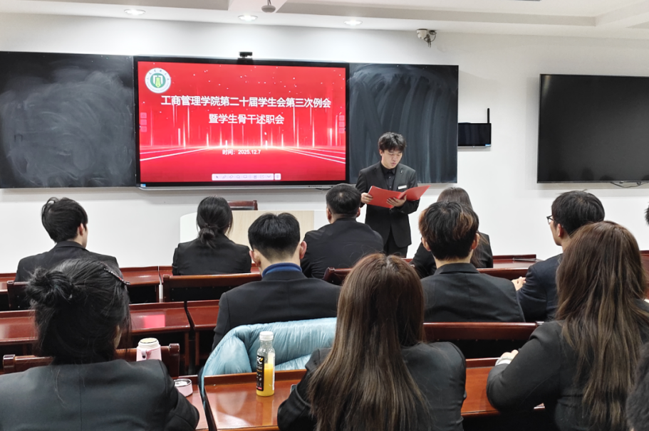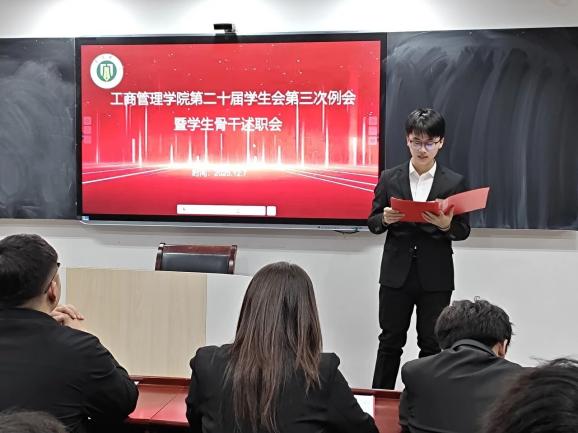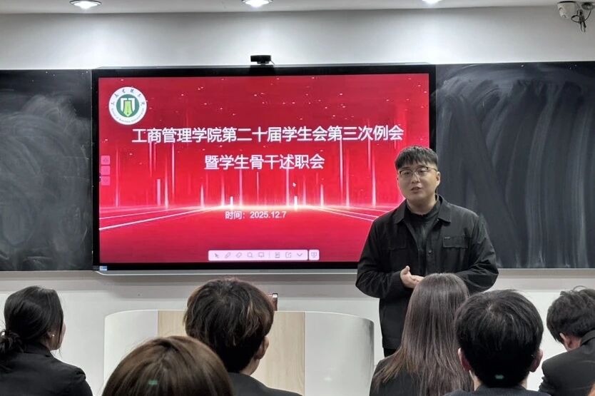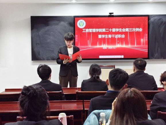 为进一步规范学生会工作流程,总结阶段性工作成果,提升学生骨干履职能力与责任意识,明确下一阶段工作方向。12月7日,工商管理学院第二十届学生会第三次工作例会暨骨干述职评议会于学院B511顺利召开。本次会议由学生会办公室主任马驰主持,团委书记赵辉及全体学生会骨干出席会议。