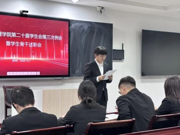 学生会主席首先发表开场讲话。他简要回顾了学生会近期在学术活动、文体赛事、志愿服务等方面开展的重点工作,肯定了全体骨干在各项活动中展现出的担当精神与协作能力,同时也指出了工作中存在的沟通效率不足、细节把控不严等问题。随后,他强调了本次述职评议会的重要意义,鼓励各位骨干坦诚交流、实事求是,通过复盘总结实现自我提升,为学生会后续工作的高质量推进奠定基础。