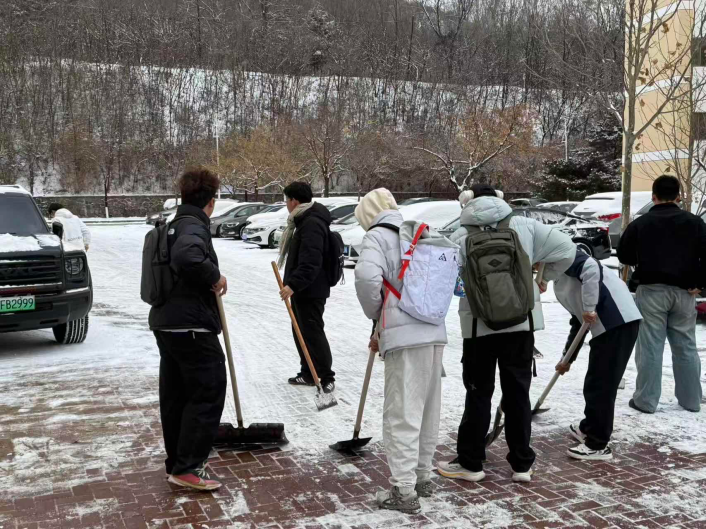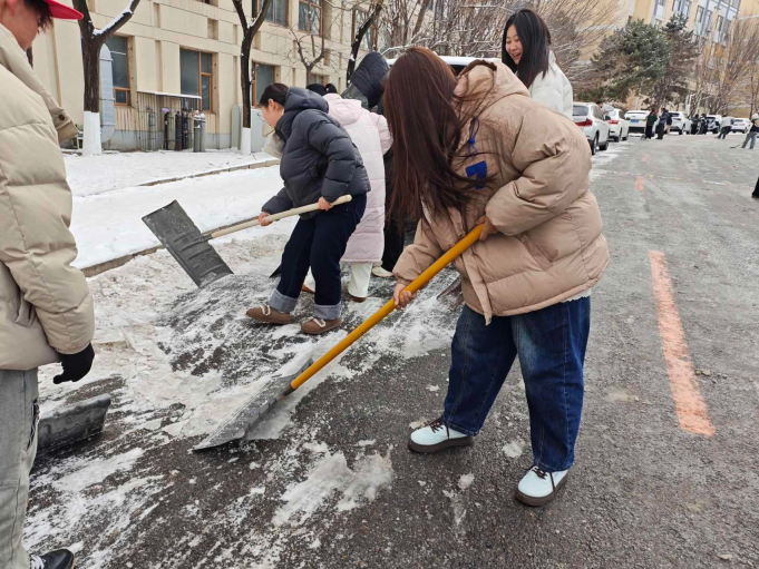 初雪漫校园,青春赴新程。随着冬日首场降雪降临,校园道路被积雪覆盖,给师生出行带来诸多不便。工商管理学院以雪为令、闻雪而动,开展除雪活动,用铁锹与扫帚为校园开辟安全通道,在寒风中书写新时代青年的奉献与热忱。 活动通知一经发布,学院学生积极响应、踊跃报名。除雪现场,尽管寒风凛冽、积雪深厚,但大家热情高涨、分工明确:有的挥舞铁锹破冰除雪,有的手持扫帚清扫残雪,有的默契配合搬运雪堆,现场一派热火朝天的劳动景象。这场除雪活动,成了新生们最生动的“集体劳动课”——从一开始的陌生拘谨,到后来的默契配合,短短几个小时,凝聚力就在扫雪的进程中悄然形成。正是同学们的辛勤付出,一条条整洁通畅的道路逐渐显现。