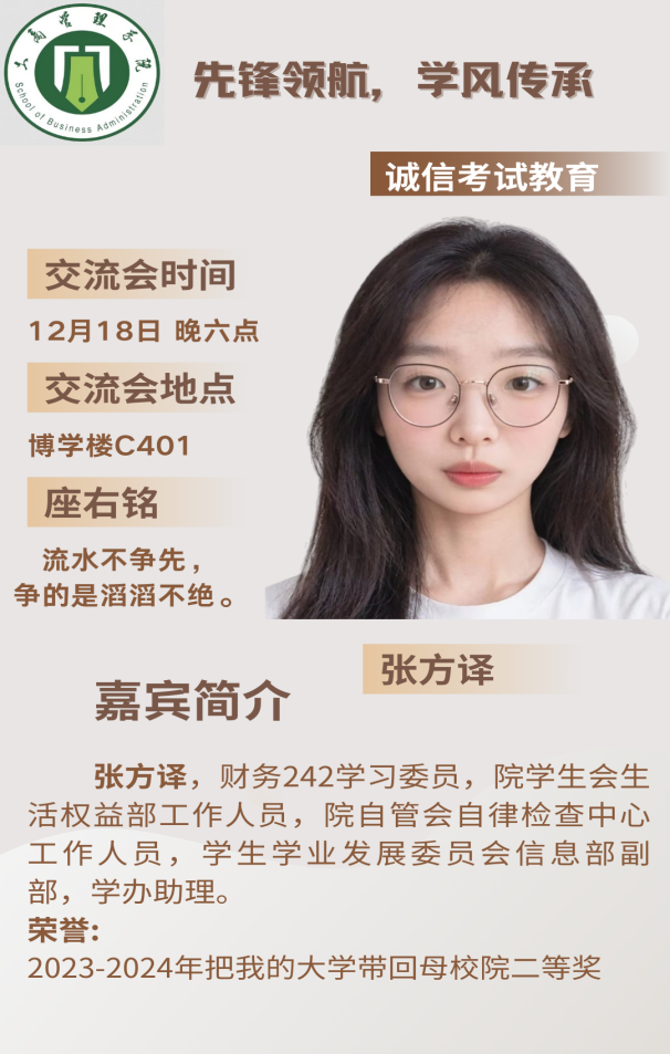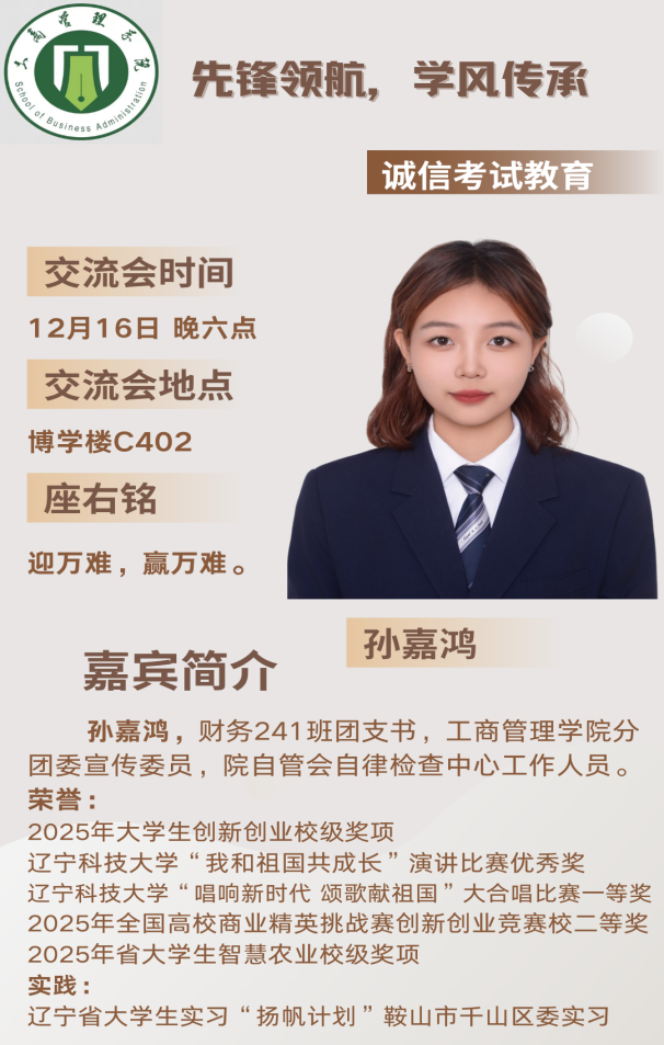 为深入贯彻“先锋领航,学风传承”的理念,筑牢诚信考试根基,传承优良学风,帮助同学们科学备战期末。工商管理学院“先锋领航,学风传承”系列宣讲之“诚信考试教育分享会”将于12月16、18日举行。本次活动邀请到孙嘉鸿、张方译两位优秀学姐,为同学们讲解诚信考试的纪律要求。