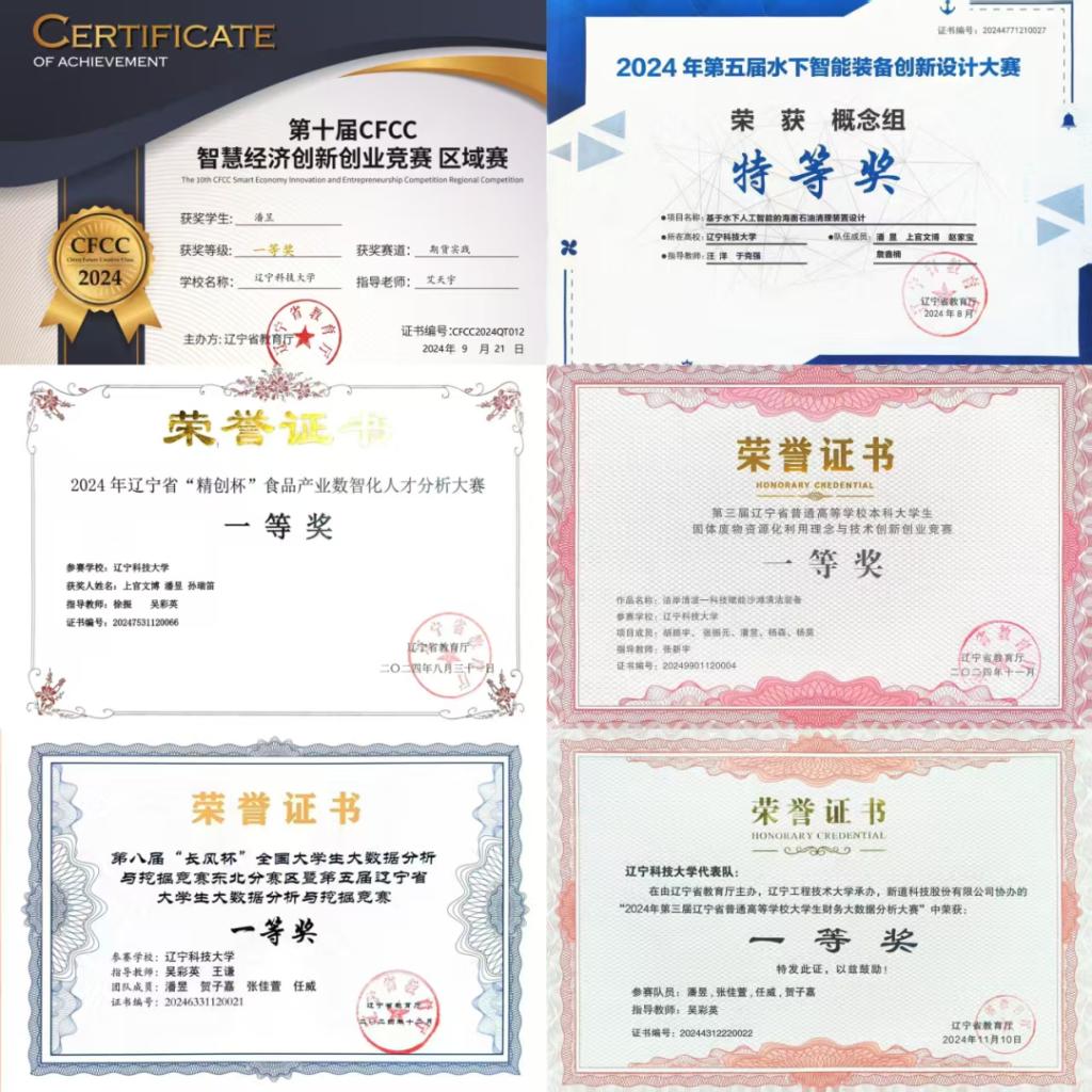 曾获全国高校商业精英挑战赛会计与商业管理竞赛国家二等奖、辽宁省财务大数据分析大赛省一等奖、辽宁省”长风杯”大数据分析与挖掘竞赛省一等奖、辽宁省第十届CFCC智慧经济创新创业大赛省一等奖、辽宁省“精创杯”食品产业数智化人才分析大赛省一等奖、辽宁省智慧农业电商创意与科研实践大赛省一等奖、辽宁省固体废物资源化利用理念与技术竞赛省一等奖等荣誉,累计荣获国家级、省级奖项共14项。专注学科交叉,围绕企业财务数字化转型的实践与效果评估开展研究,发表期刊论文1篇。