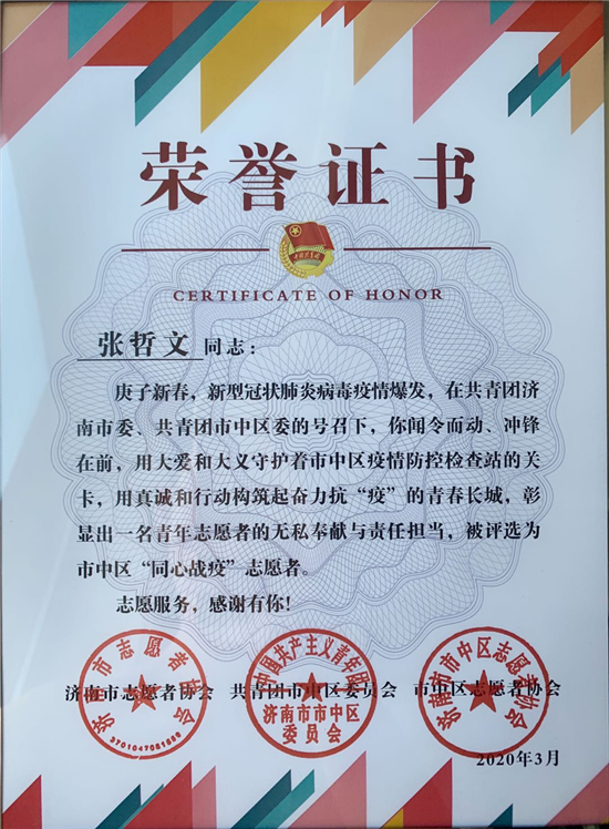 张哲文,男,汉族,1990年11月出生,中共党员,开云app官方在线入口2018级MBA研究生,现为山东航空股份有限公司员工。2020年春节期间,新冠肺炎来势汹汹,疫情就是命令,防控就是责任。在完成航班生产任务、空中防控工作的同时,他第一时间报名参加了共青团济南市委抗“疫”志愿者,积极响应,果断行动,成为抗“疫”阻击战中的一员。