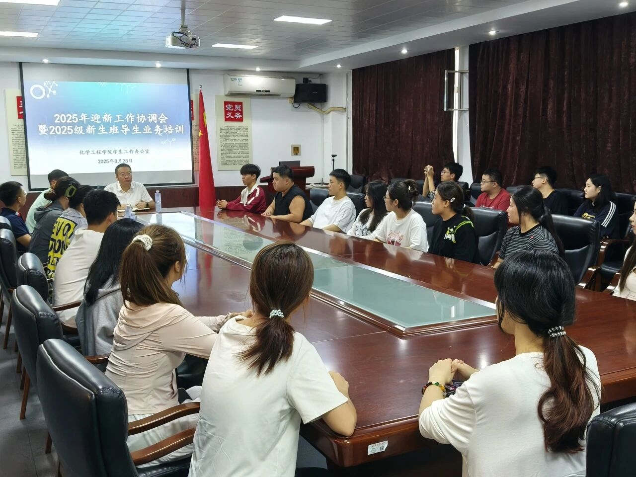为确保 2025级新生入学工作顺利开展,8月28日,化学工程学院召开迎新工作协调会,并对 2025级新生班导生进行了业务培训,旨在为新生们营造一个温馨、有序、高效的入学环境,帮助他们尽快融入大学生活,学院相关老师、新生辅导员及25级班导参会。