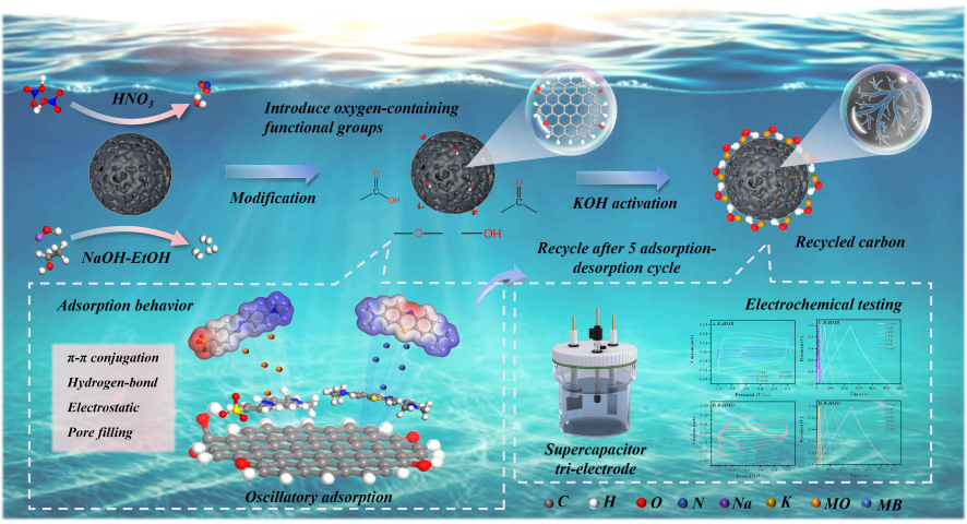超细废弃煤系针状焦生焦粉是煤焦油加工副产物,传统处理方式利用率低、易造成环境污染。研究团队创新提出绿色转化路径,将其制备为球形活性炭,并通过酸、碱功能化改性,分别显著提升对阳离子染料亚甲基蓝和阴离子染料甲基橙的吸附性能,吸附容量达到原材料的2.02倍和1.59倍。更具价值的是,团队将吸附饱和后的材料经KOH活化,成功转化为超级电容器电极材料,其比电容在0.5 A/g条件下达到153 F/g,实现了从“废水净化”到“电能存储”的全程资源化利用,构建了“以废治废—废料再生”的完整技术链条。