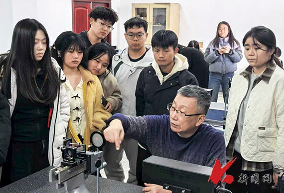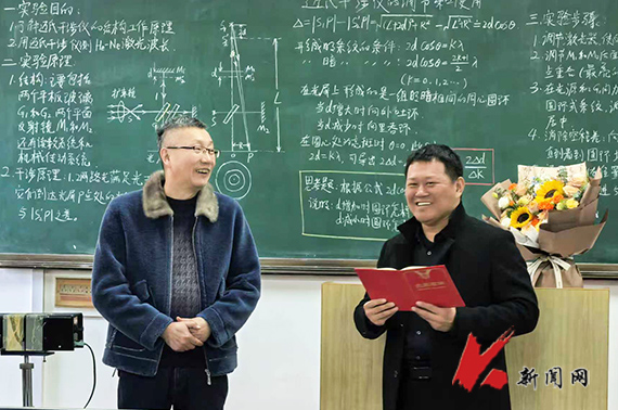 上午三四节课,郇维亮一如既往、神情专注地为卓冶金2023.3班学生讲授大学物理实验课。实验中心教师前来听课,与学生共同聆听郇维亮职业生涯的“最后一课”。课程结束后,学生代表献上鲜花,全体学生向他鞠躬致谢,送上最真挚的祝福。
