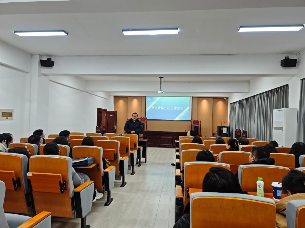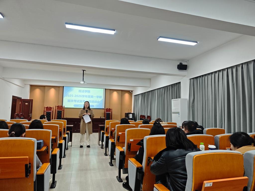 2025年12月30日下午,经法学院召开期末考试工作专题会议,全面部署本学期期末考试相关事宜,对监考教师进行考前培训。会议由学院副院长邵玲主持,经法学院院长郭浩淼及全体教师参会。