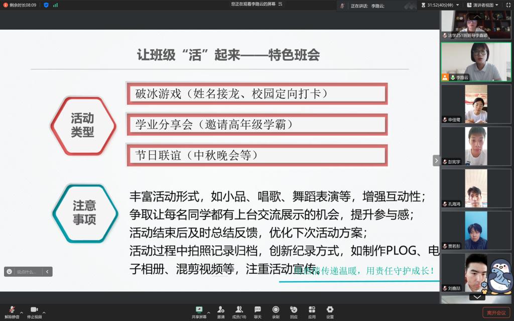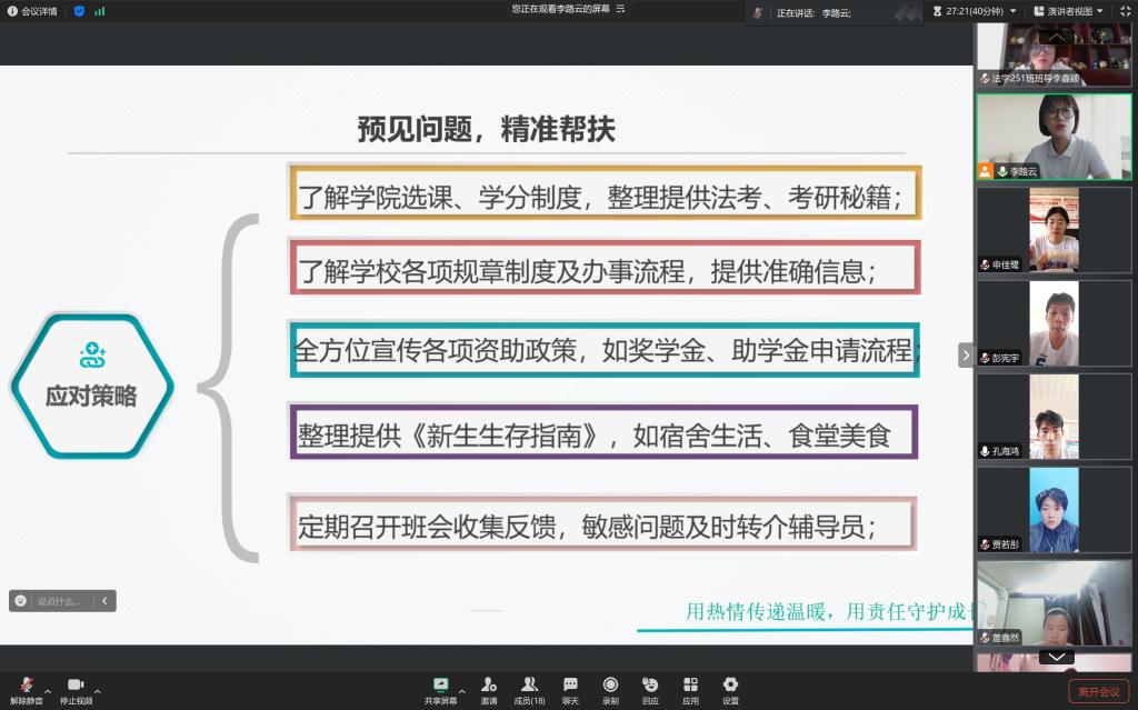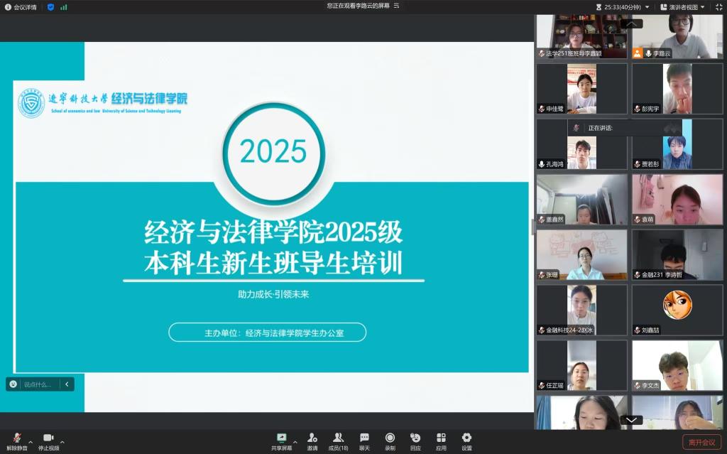 7月12日下午,经法学院通过腾讯会议召开2025级本科生新生班导生培训会议。会议由经法学院学办主任暨2025级新生辅导员李路云主持,全体2025级新生班导生参加了会议。