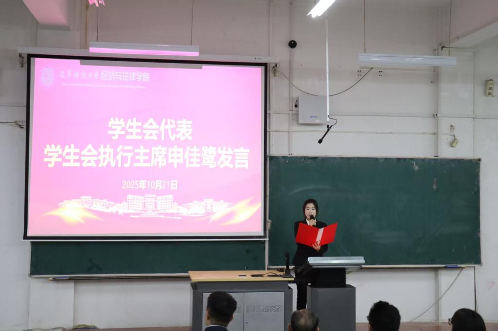 在学生干部表态发言环节,学生会执行主席申佳鹭以“做学风建设表率”为主题发言。她表示,学生干部应以学为先,夯实成长根基;以用为本,提升综合能力。金融23-1班班长孔思文结合连续两年获评“优良学风班”的经验,分享了学风建设的具体做法:以积极向上的班训为引领,搭建多元学习平台,由班委带头、全员参与,共建优良学风。