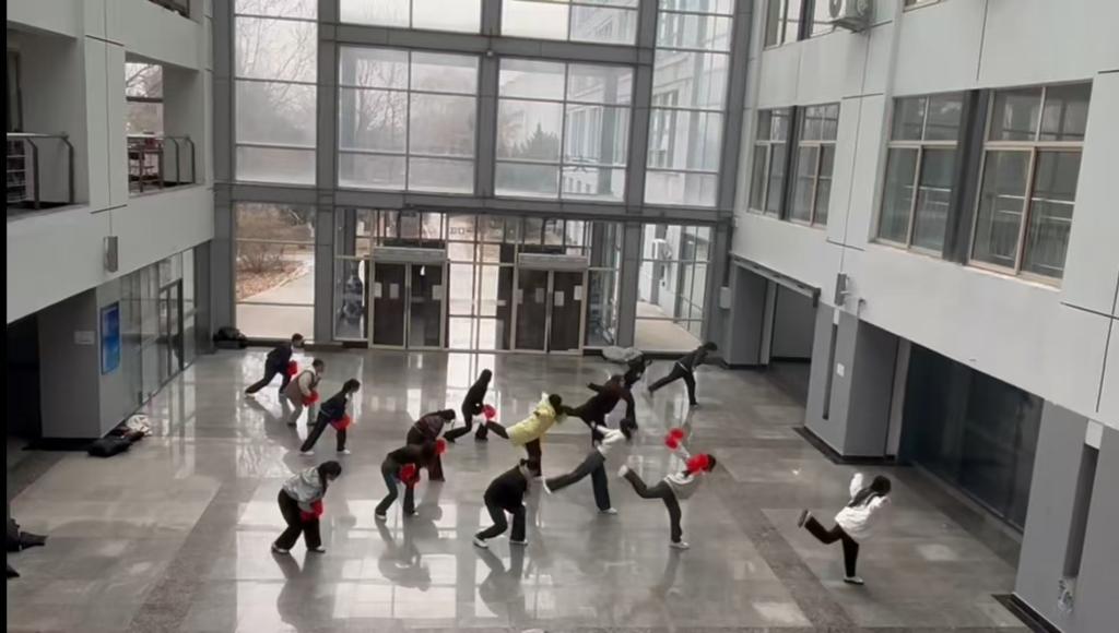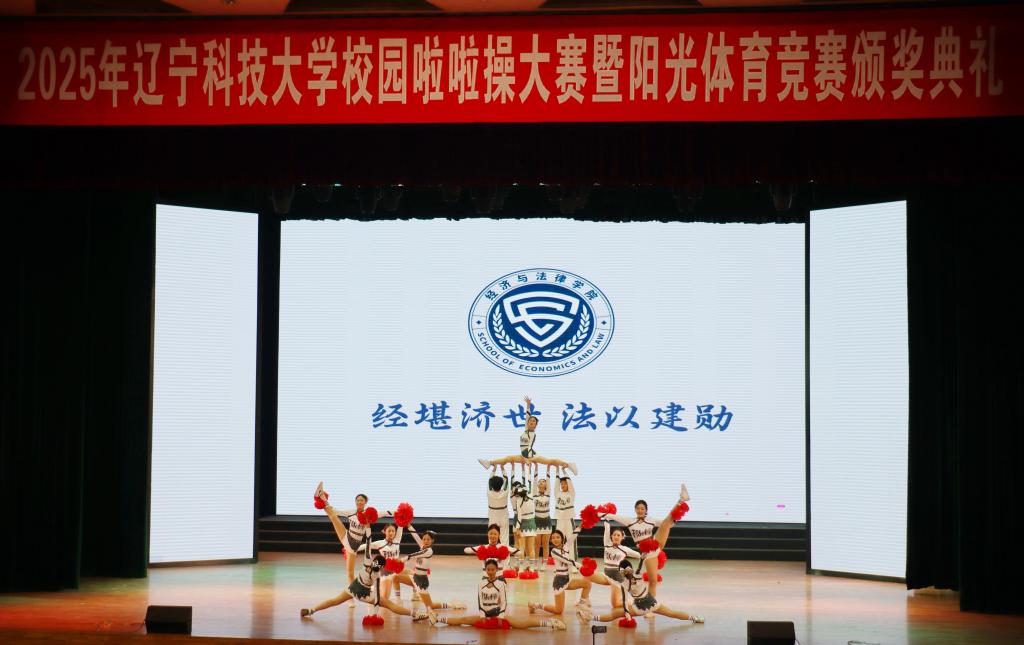 在备受瞩目的“彩虹杯”啦啦操大赛中,经法学院啦啦操队员们身着设计精巧、配色和谐的比赛服装精彩亮相,洋溢着青春的勃勃生机。他们随着音乐的旋律翩翩起舞,以铿锵有力的节奏挥洒着矫健身姿,跃动、旋转、定格,每一个动作都如行云流水,自然流畅,于整齐划一中展现出灵动之韵。随着音符的跃动,队形在舞台上穿梭变化,将力量与美感织就成一幅动人的画卷。他们脸上的昂扬笑意、眼中的坚定光芒,与舞动的身影交相辉映,生动勾勒出经法学子昂扬向上、齐心协力的精神风貌。