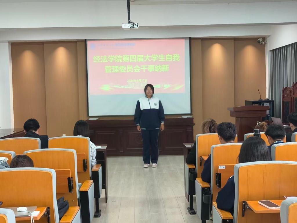 9月27日下午,经法学院于博识楼A402召开经法学院第四届大学生自我管理委员会(简称自管会)干事竞选会议。会议由经法学院自管会主席刘鑫喆主持,学院学办主任李路云出席会议,共有20名同学参与竞选。