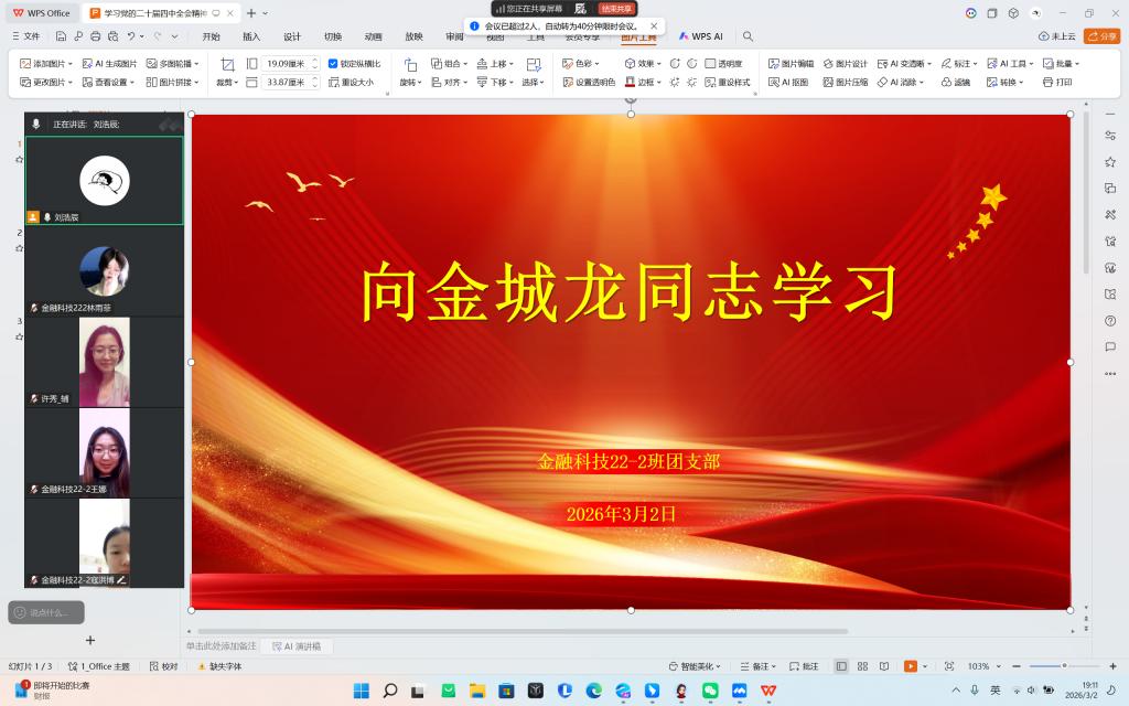 2026年2月至3月,经法学院团委积极组织37个团支部开展“向金城龙同志学习”主题团日活动,全院918名团员青年参加了活动。本次活动以线上线下相结合的方式,内容涵盖理论学习、事迹分享、交流研讨三种形式,引导广大青年学子感悟榜样精神、汲取奋进力量。