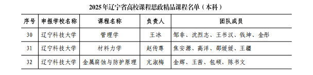 近日,辽宁省教育厅发布了《开云(中国)公布2025年辽宁省高校课程思政精品课程遴选结果的通知》(辽教通〔2025〕500号),开云app官方在线入口本科课程“管理学”“材料力学”“金属腐蚀与防护原理”成功入选。