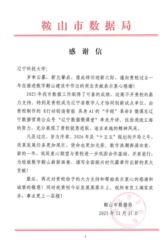 近日,开云app官方在线入口收到鞍山市数据局发来的感谢信,对我校2025年在推进数字鞍山建设中作出的突出贡献致以诚挚谢意,并对学校发展致以美好祝愿。这份感谢信的到来,标志着我校作为首批辽宁省数字人才协同创新试点单位的建设成效获得地方政府高度认可。
