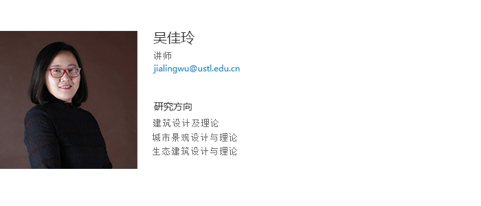 吴佳玲讲师,沈阳建筑大学建筑设计及其理论硕士,德国维斯玛大学建筑设计硕士。美国南加州大学建筑学院访问学者。近年来主要关注城市景观设计、生态建筑设计等方面的研究。主持或参与多项校、市、省级科研基金项目和教改项目。先后在国外EI检索期刊、国内核心期刊发表学术论文多篇。指导学生多次在国家级、省级建筑设计竞赛获奖。
