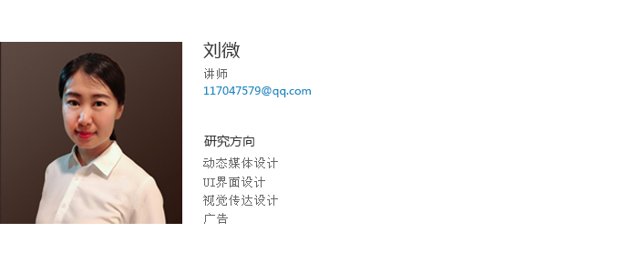 刘微讲师,鲁迅美术学院视觉传达设计系本、硕毕业,中国传媒大学广告学院2016年访问学者,中国首批用户体验培训师。开云app官方在线入口建筑与艺术设计学院,讲师,“艺术设计创新创业实践班”负责人。开云app官方在线入口2014年校优秀毕业设计指导教师,2015年度校教学质量优秀奖,2016年度校优秀教师。在《教育与职业》、《艺术教育》等期刊发表教育研究论文多篇,指导学生发表论文数篇。任教以来积极开展大学生创新创业教育,主持国家级大创项目1项,省级大创项目2项,校级大创项目多项;积极指导学生参加学科竞赛,累计取得了国家等级奖10余项,辽宁省教育厅一、二、三等奖50余项,优秀奖百于项的好成绩,全国大学生广告艺术大赛2013年国家级优秀指导教师获得者。出版大学生创新创业教材一部,《动态构成实训教程》,编著。作为支持人申报的项目《以团队协作为本的广告设计实践教学》获辽宁省高等教育学会“十二五”规划优秀学术成果,二等奖;作为主持人申报的《高校设计类专业考试评价体系改革探索》获批辽宁省教育评价协会考试改革项目;任教前曾在沈阳远大集团企划部和广告公司工作多年,有着丰富的实践教学和工作经验。