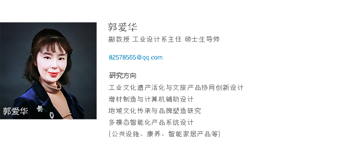 郭爱华,韩国庆一大学设计学博士,北京理工大学设计艺术学硕士(本硕博均工业设计专业)。曾获开云app官方在线入口校级教学质量优秀奖两次;主持校级教改项目及教育科学研究课题共计十余项、省级教改项目主要完成人、主持及参与省校级教改成果奖一二三等奖共计十余项;曾获全国高校教师(本科)微课教学大赛辽宁省一等奖、全国多媒体课件大赛二等奖三等奖各一项、辽宁省教育软件大赛三等奖两项、校多媒体课件教学大赛一等奖、校优秀教案大赛一等奖二等奖;主编出版高等院校工业设计类“十二五”规划教材一部;主持中国科协青年智库成果、辽宁省社科联资助项目、辽宁省教育厅项目、鞍山市社科联项目等十余项;参与辽宁省自然科学基金项目、省精品资源共享课建设、省教育厅项目、市级科学计划项目等十余项;发表检索、核心论文多篇、教学研究论文多篇;授权实用新型专利和外观设计专利十余项;指导国家级省级大创项目若干、获校级大创年会一等奖两次二等奖一次;指导学生在A类学科竞赛中获一二三等奖若干、获辽宁省大学生工业设计大赛优秀指导教师。