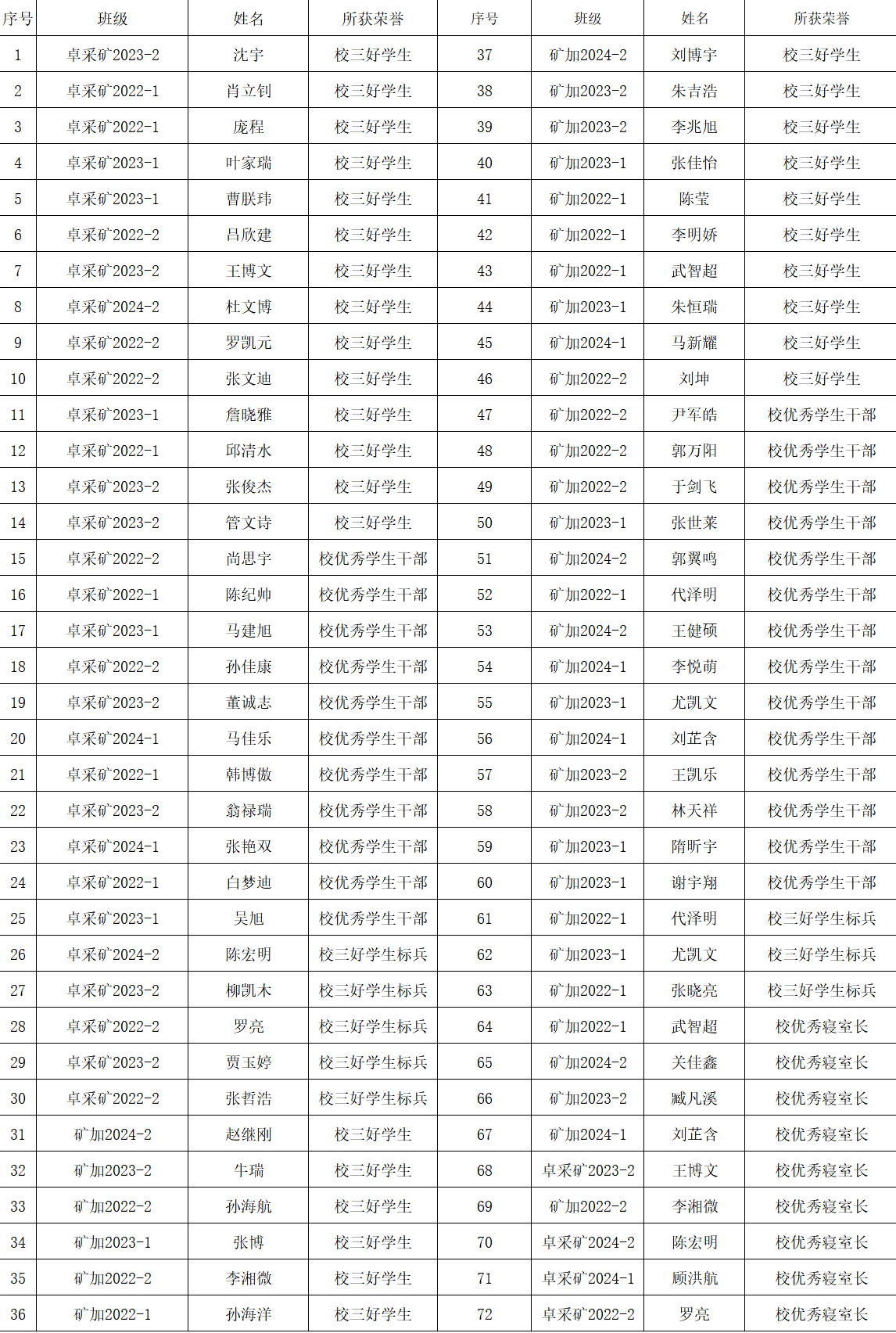 经个人申请,学院评优评审小组评选、审查,现对矿业学院2024-2025学年度校内评优奖项进行公示: