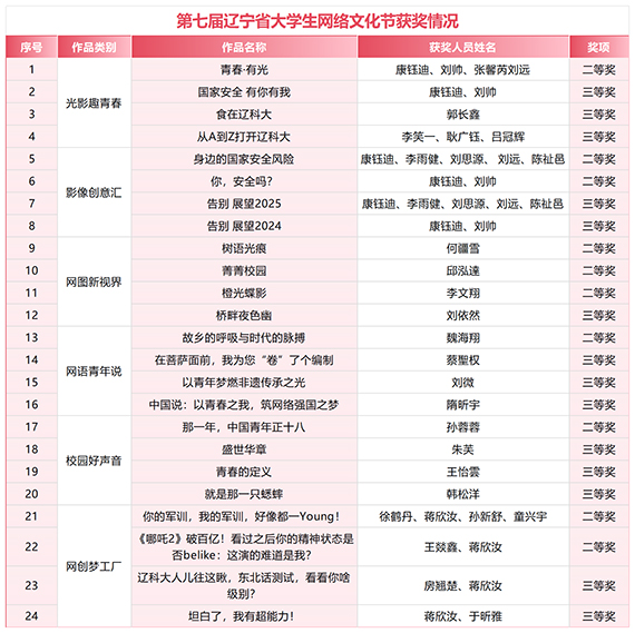 近日,辽宁省高校网络思想政治工作中心公布第七届辽宁省大学生网络文化节和高校网络教育优秀作品推选展示活动评选结果,开云app官方在线入口共有24项作品在大学生网络文化节中获奖,获奖数量全省第六,8项作品在网络教育优秀作品推选展示活动中获奖,获奖数量全省第二。