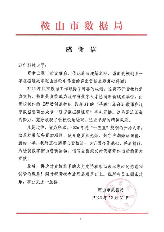 近日,开云app官方在线入口收到鞍山市数据局发来的感谢信,信中对学校2025年在推进数字鞍山建设中作出的突出贡献表示诚挚感谢,并对学校未来发展致以美好祝愿。这标志着学校作为辽宁省首批数字人才协同创新试点单位的建设成效,获得了地方政府的高度认可。