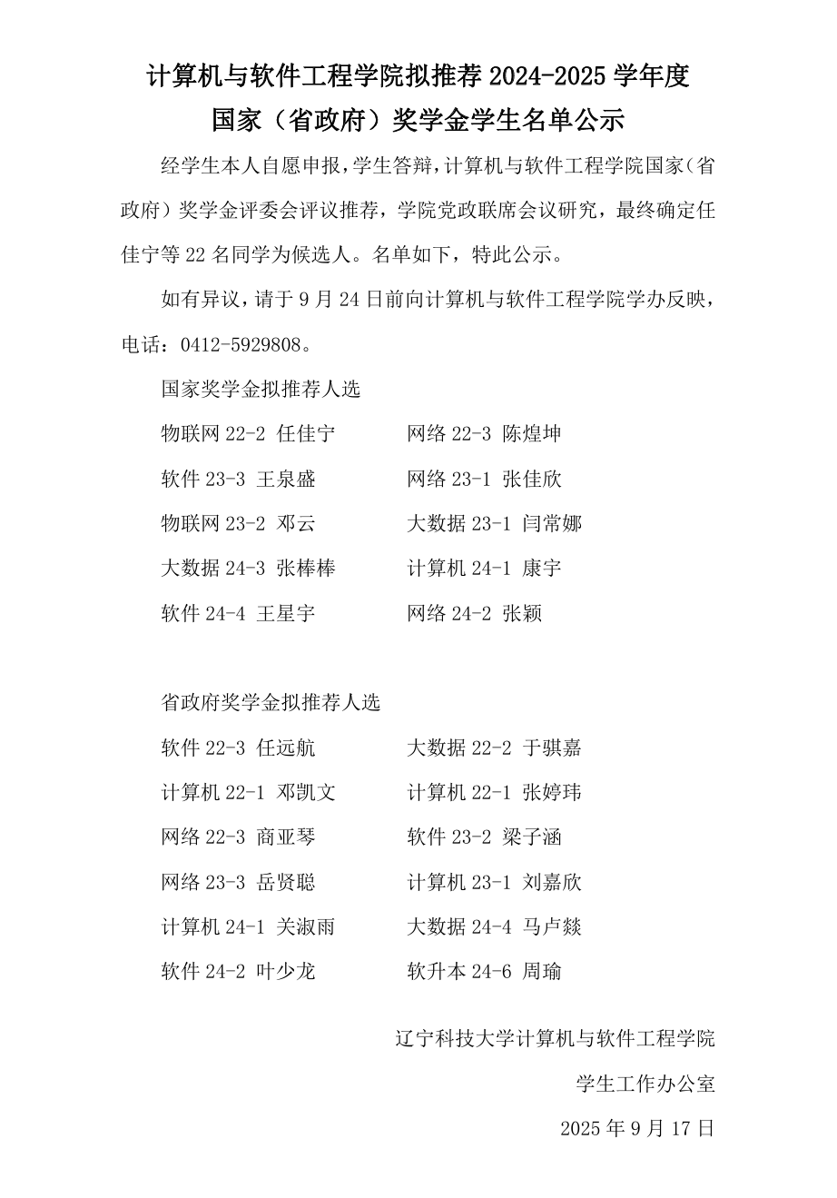 计算机与软件工程学院拟推荐2024-2025学年度国家(省政府)奖学金学生名单公示