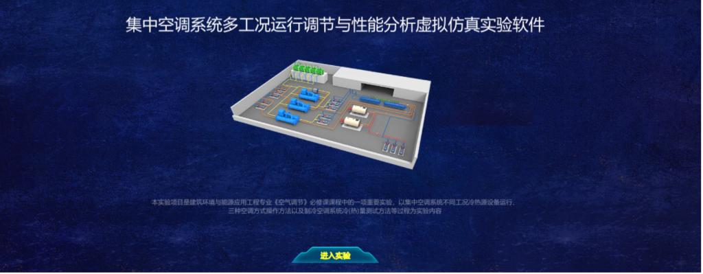 实验简介:该实验面向建筑环境与能源应用工程专业,设置集中空调系统多工况运行调节与性能分析的实验任务,培养学生跨学科扩展知识、多专业综合应用能力。该虚拟仿真软件预制技术参数,通过工程设计、制冷机房和各楼层空调系统漫游、工况选择与操作仿真、设备仿真以及在线考试环节,学生可以系统学习空调设备构成和系统布置等知识。空调工程各环节模拟和空调工程三维再现,学生能够学习有关空调系统设备构成、系统形式等基础知识,也能掌握不同工况下空调系统的切换操作、了解系统各项热工参数的测量,分析系统的综合性能等。